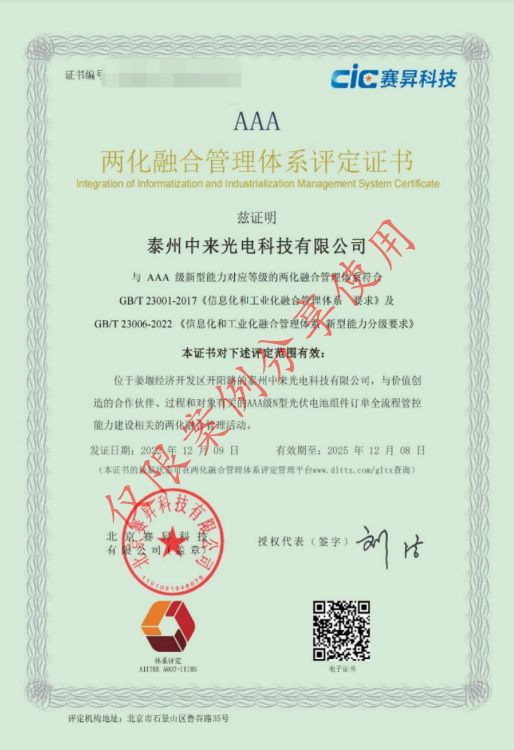 近日,由優特力科技輔導的泰州中來光電科技有限公司正式獲得兩化融合管理體系評定證書,評定等級為“AAA”級,這標志著中來光電在數字化轉型方面取得了新的進展,在推進兩化融合方面取得了新的突破。