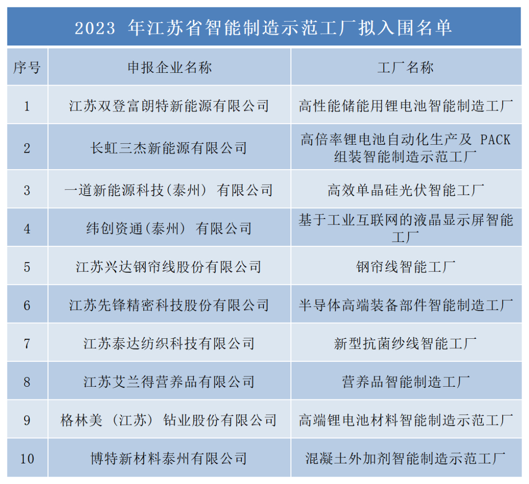 熱烈祝賀泰州市10家企業(yè)入選2023年江蘇省智能制造示范工廠擬入圍名單