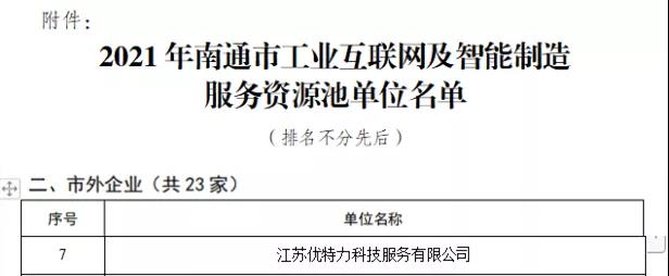 近日,2021年“南通市工業互聯網及智能制造服務資源池單位”名單公布,江蘇優特力科技服務有限公司再次入選。