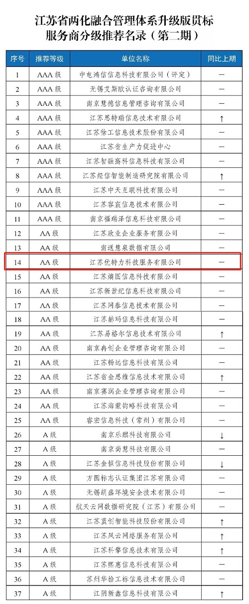 在江蘇省工業和信息化廳的指導下,江蘇省兩化融合貫標咨詢服務聯盟(以下簡稱“聯盟”)2021年上半年組織開展了江蘇省兩化融合管理體系升級版貫標服務商分級推薦名錄更新申報工作。2021年下半年,經企業申報、聯盟統計、專家評審等環節,認定中電鴻信信息科技有限公司等11家企業為AAA級貫標服務商,江蘇優特力科技服務有限公司等14家企業為AA級貫標服務商,南京樂麒科技有限公司等12家企業為A級貫標服務商,現將認定結果予以公示。