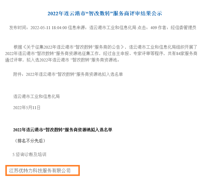 連云港市工業和信息化局近日公布了2022年“智改數轉”服務商名單,優特力科技成功入選。